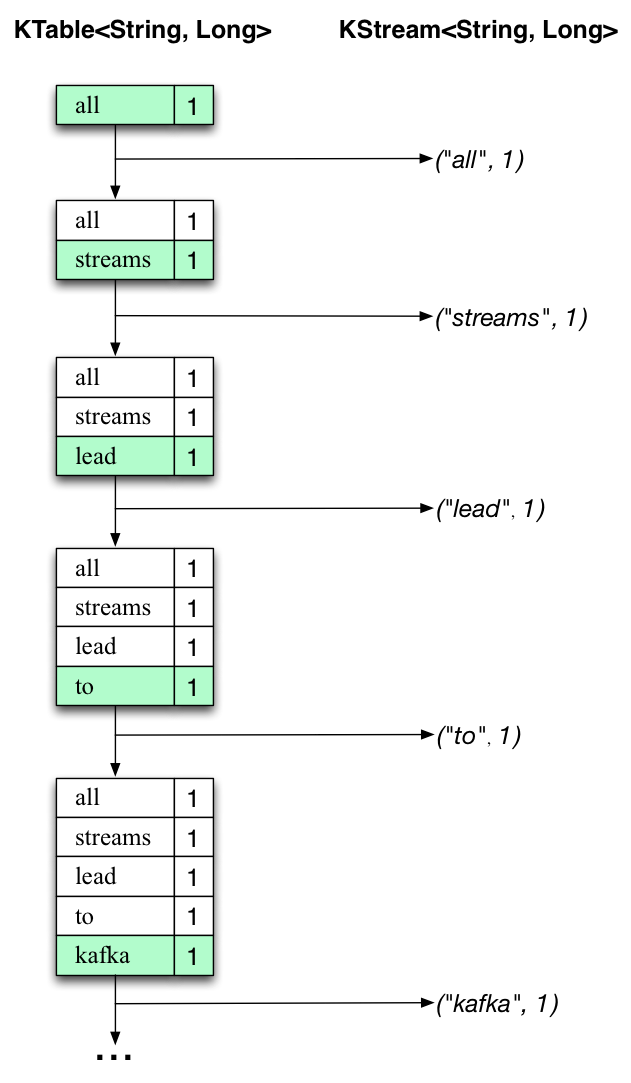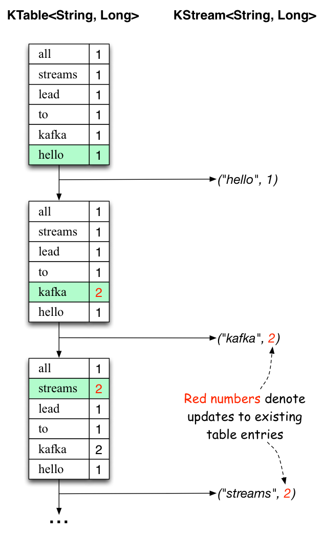 The two diagrams below illustrate what is essentially happening behind the scenes. The first column shows the evolution of the current state of the KTable<String, Long> that is counting word occurrences for count. The second column shows the change records that result from state updates to the KTable and that are being sent to the output Kafka topic streams-wordcount-output.